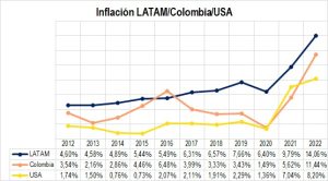 2.1. Ahora bien, para el caso de Colombia no solo las consecuencias por el alza de la tasa de interés por parte de la FED están afectando al peso, también asuntos internos han venido contribuyendo. Como tema principal, se ubican los diversos debates con relación a la reforma tributaria propuesta por el gobierno del presidente Petro, los gremios han manifestado sus preocupaciones enfatizando que el aumento en la carga de impuestos llegaría a tener el efecto deseado en un corto plazo, pero sí lo analizamos en un escenario de largo plazo estaríamos frente a tasas negativas del crecimiento económico lo que ocasionaría ralentización en la reducción de la pobreza, y una disminución en las inversiones ya que el costo de invertir se incrementaría.