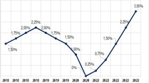 Partiendo de lo anterior, gracias al incremento de la tasa de interés anunciado por el banco central de Estados Unidos en un 0,75% que tiene como principal objetivo luchar contra el encarecimiento de los productos, que no solo se ven afectados sus distintos mercados, teniendo como ejemplo el alza en el dólar que se traduce en una devaluación de las distintas monedas. Tomando esto en consideración, la FED «Federal Reserve» espera que, para su próxima junta programada para los días 1 y 2 de noviembre, tome decisiones al respecto lo que podría significar una subida en las tasas de interés, con el fin de frenar el incremento en los precios, estabilizando de esta manera la economía. Ver gráfica 2.