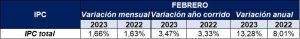 Variación anual y mensual de la inflación en Colombia al mes de febrero de 2023 donde, según el DANE las cuentas que tuvieron una variación importante fueron: Educación con un (8,50%), Muebles, artículos para el hogar y para la conservación ordinaria del hogar (2,04%),Transporte (1,99%), y Bienes y servicios diversos (1,97%). Ver tabla 1.