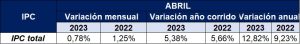 Variación anual y mensual de la inflación en Colombia al mes de abril de 2023 donde, según el DANE las cuentas que tuvieron una variación importante fueron: Bebidas alcohólicas y tabaco con un (1,43%), Transporte (1,28%), Alojamiento, agua, electricidad, gas y otros combustibles (1,15%), Muebles, artículos para el hogar y para la conservación ordinaria del hogar (1,05%), Salud (1,04%), Transporte (1,37%), Restaurantes y Hoteles (1,04%). y Bienes y servicios diversos con un (0,90%) Ver tabla 1.